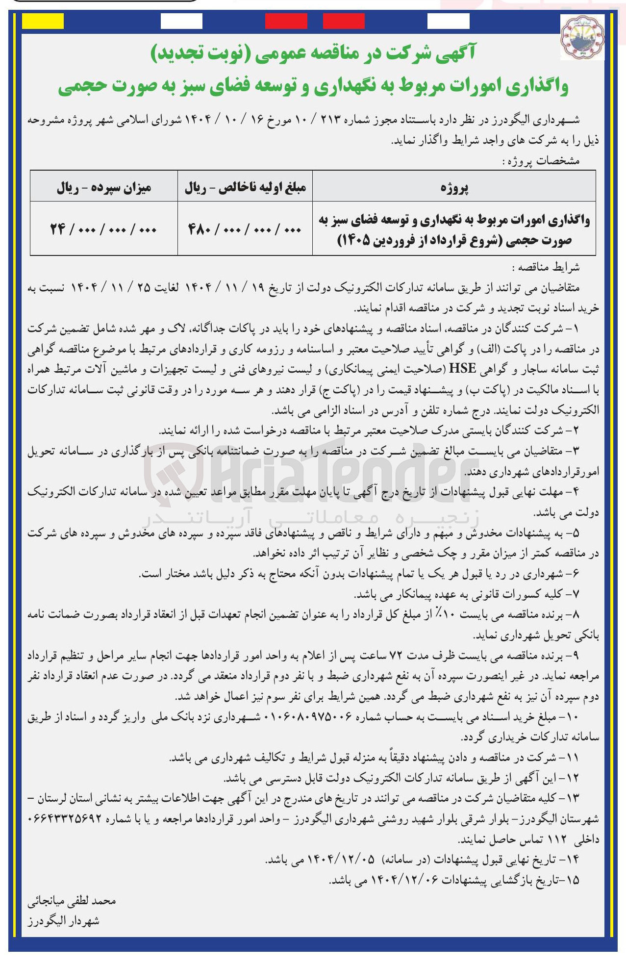 آگهی شرکت در مناقصه عمومی نوبت تجدید واگذاری امورات مربوط به نگهداری و توسعه فضای سبز به صورت حجمی شهرداری الیگودرز در نظر دارد باستناد مجوز شماره ۲۱۳ / ۱۰ مورخ ۱۶ / ۱۰ / ۱۴۰۴ شورای اسلامی شهر پروژه مشروحه ذیل را به شرکتهای واجد شرایط واگذار نماید . ...