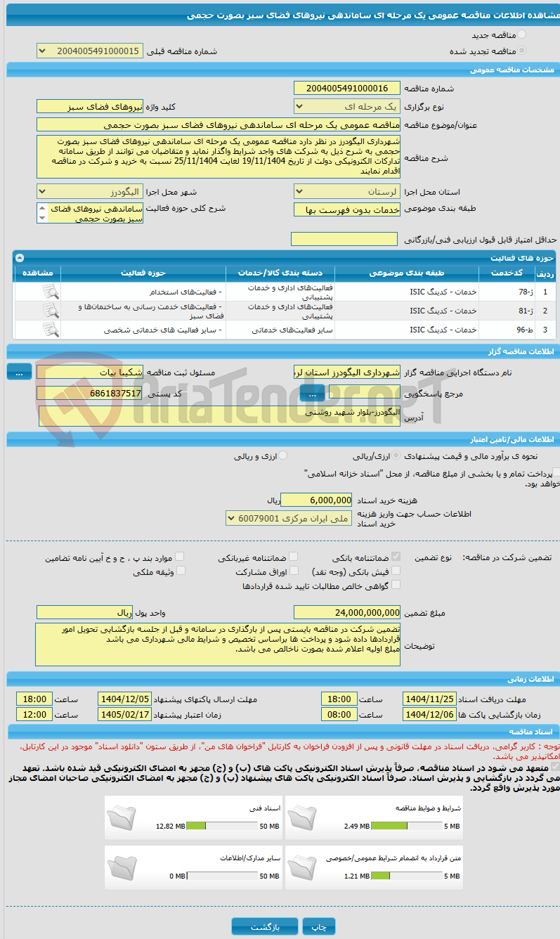 شهرداری الیگودرز در نظر دارد مناقصه عمومی یک مرحله ای ساماندهی نیروهای فضای سبز بصورت حجمی به شرح ذیل به شرکت های واجد شرایط واگذار نماید و متقاضیان می توانند از طریق سامانه تدارکات الکترونیکی دولت از تاریخ 19/08/1404 لغایت 24/08/1404 نسبت به خرید و شرکت در مناقصه اقدام نمایند نوع آگهی مناقصه نوع برگزاری ...